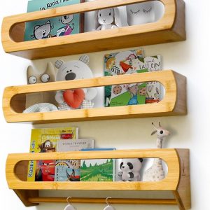 Bamboo Nursery Book Shelves, Fully Assembled For Easy Use – Set of 3 Floating Shelves for Wall Kids, Wall Mounted Book Shelves For Kids Room, Baby Room, Toddler Room, Nursery Decor, 16.5 Inch Natural