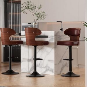 Bar Stools Set of 3 Seat Adjustable Height 24.5-33.5IN – Bentwood Swivel Barstools with Back & Footrest – PU Leather Upholstered Bar Chair for Bar, Kitchen, Dining Room