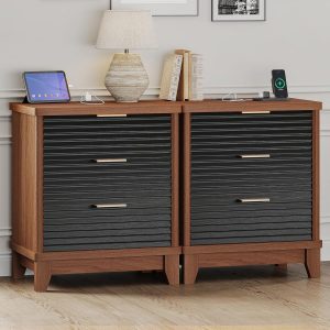 AOGLLATI Fluted Night Stand Set of 2 with Charging Station and 3 Drawers, Black Nightstands Set of 2, Beside Table with Slanted Louvered Design,Retro End Side Table for Bedroom (2, Black)