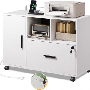 DEVAISE File Cabinet with Charging Station, 1-Drawer Lateral File Cabinets with Lock for Home Office, Wooden Rolling Printer Stand with Shelves, White