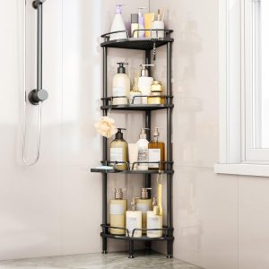 Consumest Corner Shower Caddy Stand – 4 Tier Shower Organizer with Soap Holder, Tall Floor Corner Shelf Standing with Adjustable Feet & 4 Hooks, Storage Rack for Bathroom Black