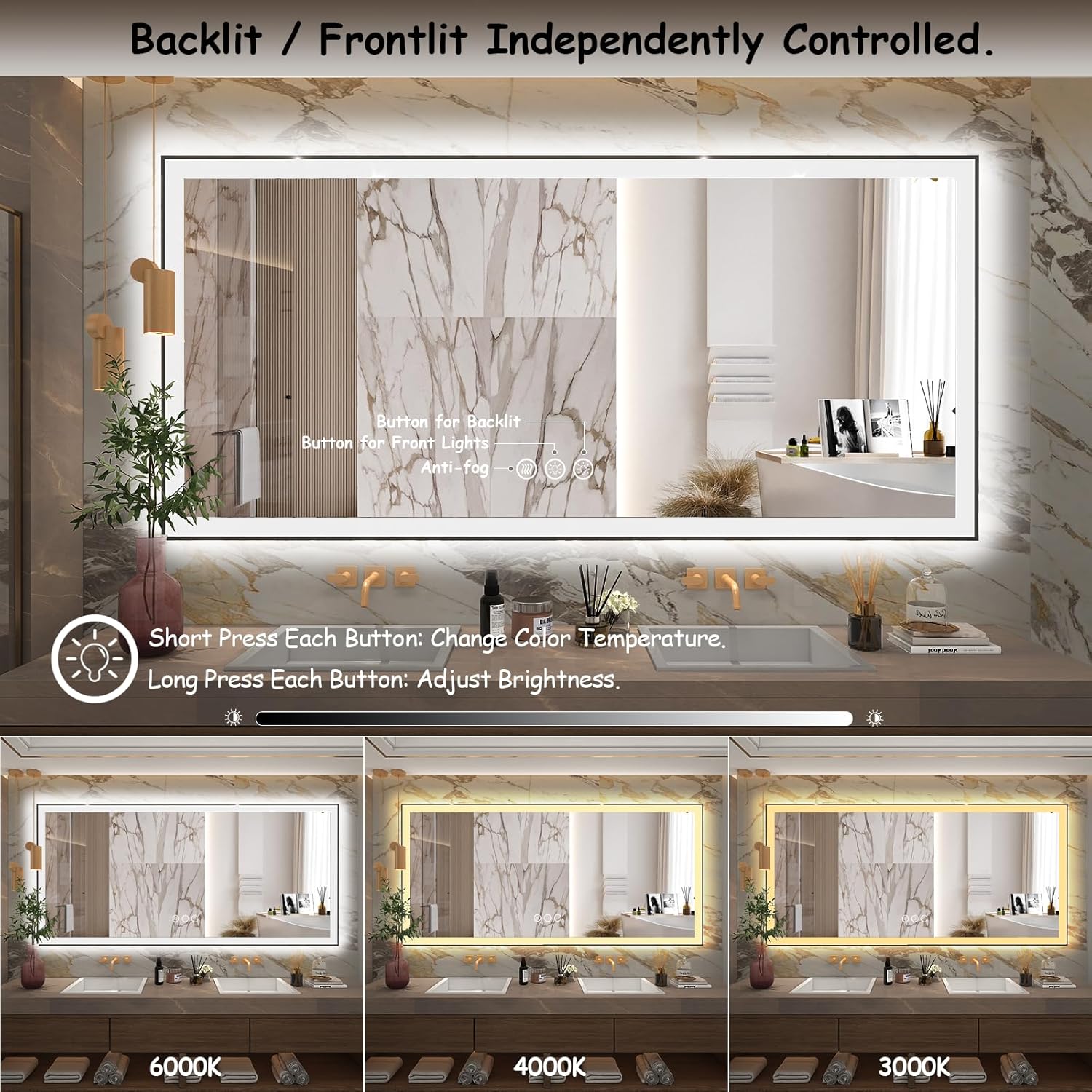 • 【Independent Backlit and Frontlit】The backlit and front lights of framed led mirror can be controlled separately. You can choose to turn on only the backlight or front lights or turn them on simultaneously to choose different lighting effects for different scene.