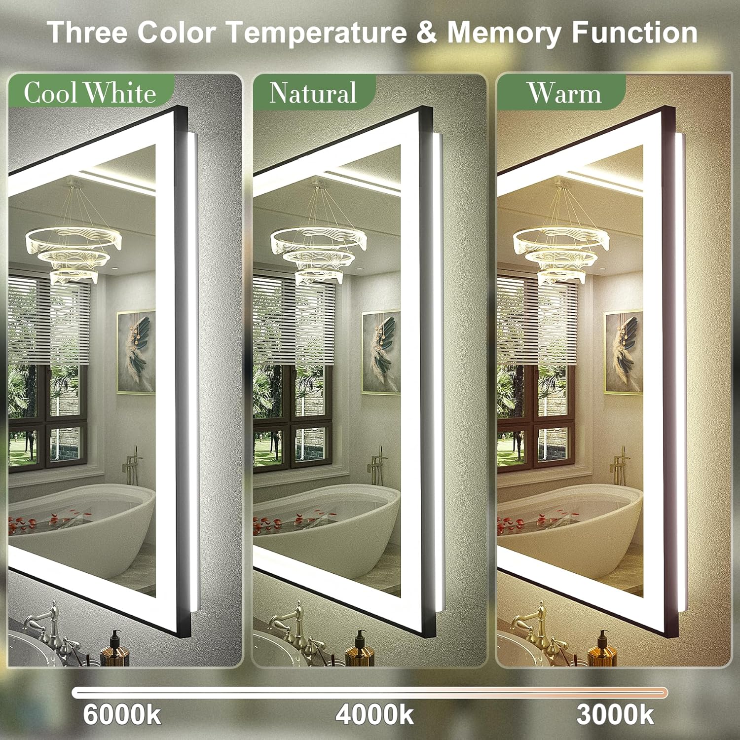 • 【Colors Changeable and Brightness Dimmable】This multifunctional illuminated mirror is convenient for anyone to use which is easily controlled by touching the buttons on the mirror surface. Short press each light button to change the colors(warm 3000K/neutral 4000K/white 6000K). Long press each light button to adjust the brightness. The brightness setup will be remembered for next use when it is controlled by wall switch.